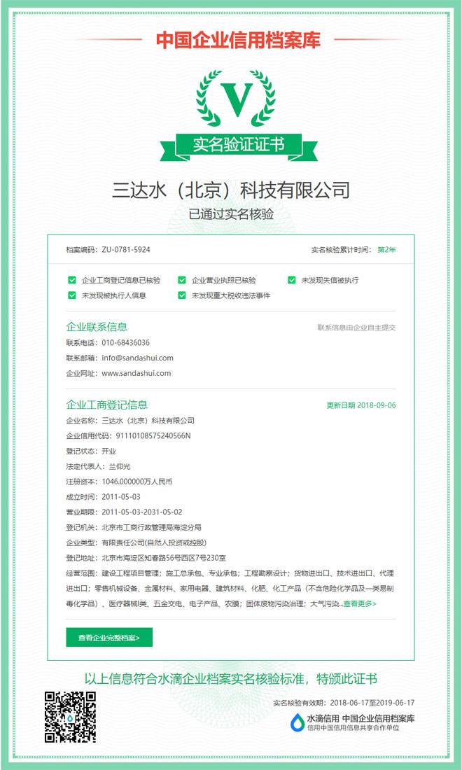 三達(dá)水加入中國(guó)企業(yè)信用檔案庫(kù)