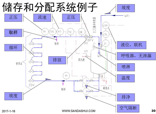 注射水供水水泵的出水應設計成"紊流式"以阻止生物膜的形成分配系統(tǒng)的管路,安裝應有足夠的坡度并設有排放點以便系統(tǒng)在必要時能夠完全排空。水循環(huán)的分配排放系統(tǒng)應避免低流速隔膜閥具有便于去除閥體內(nèi),溶解雜質(zhì)和微生物不易繁殖的特點。